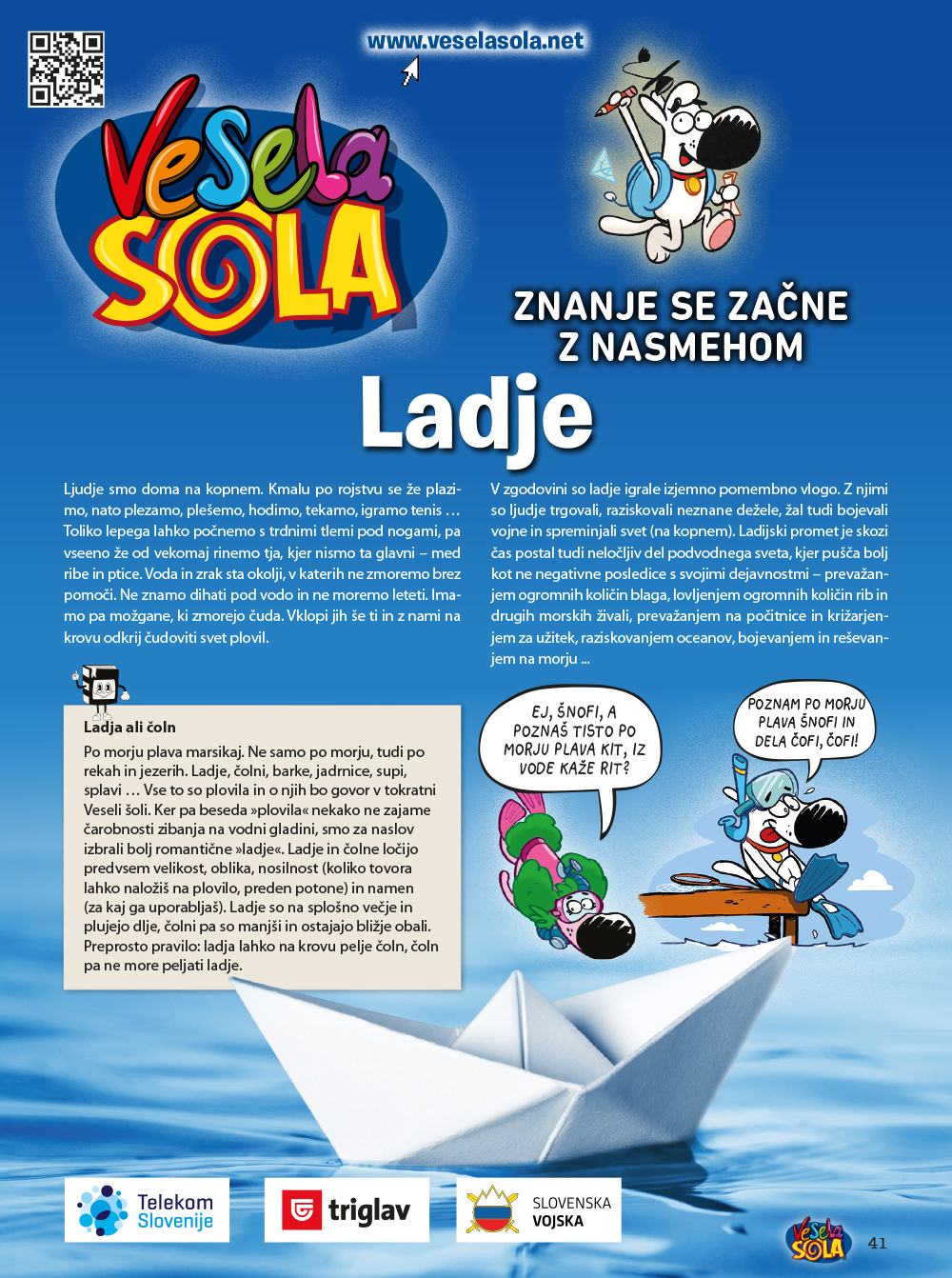 Po morju plava marsikaj. Ne samo po morju, tudi po rekah in jezerih. Ladje, čolni, barke, jadrnice, supi, splavi … Vse to so plovila in o njih bo govor v tokratni Veseli šoli.